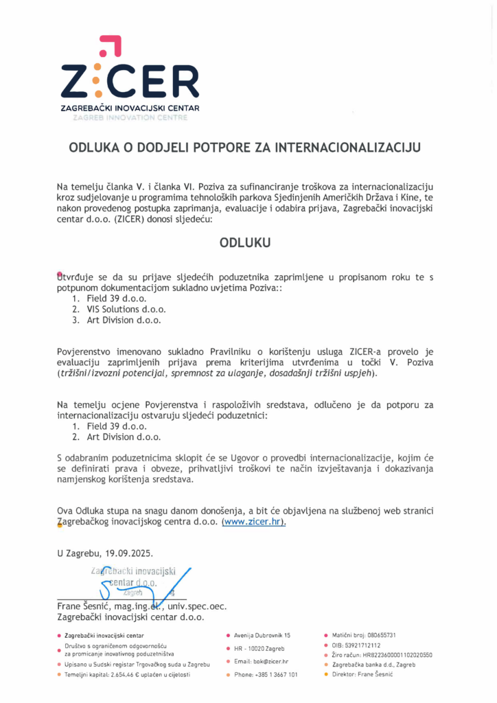 Na temelju članka V. i članka VI. Poziva za sufinanciranje troškova za internacionalizaciju kroz sudjelovanje u programima tehnoloških parkova Sjedinjenih Američkih Država i Kine, te nakon provedenog postupka zaprimanja, evaluacije i odabira prijava, Zagrebački inovacijski centar d.o.o. (ZICER) donosi sljedeću: